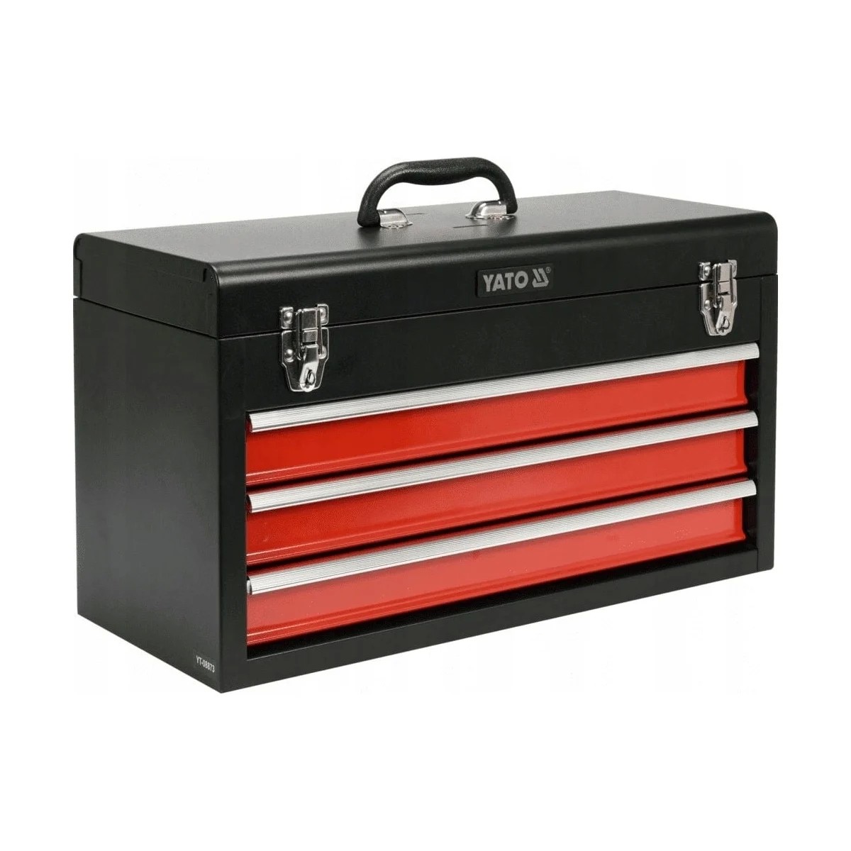 Ящик для инструмента оснащен выдвижными ящиками, установленными на металлических шариковых направляющих. Имеет дополнительный отсек для хранения. Верхний ящик закрывается на металлические защелки. При установке навесного замка на крепления центральный замок ящиков активируется при закрытии крышки ящика. Эргономичная нескользящая ручка обеспечивает удобство использования.