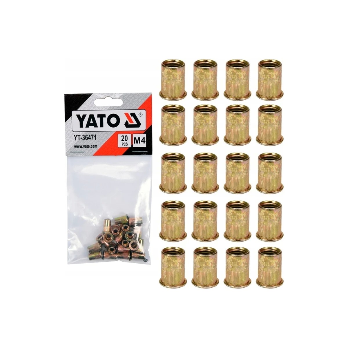Резьбовая заклепка YATO сталь, М4, 20 шт. YT-36471 позволяет вкручивать винт или болт с метрической резьбой в листовой металл или другие материалы, где невозможно нарезать резьбу. Цилиндрический фланец с накаткой, благодаря чему он более плотно прилегает к закрепляемому элементу. Внешний диаметр: 5.9 мм.