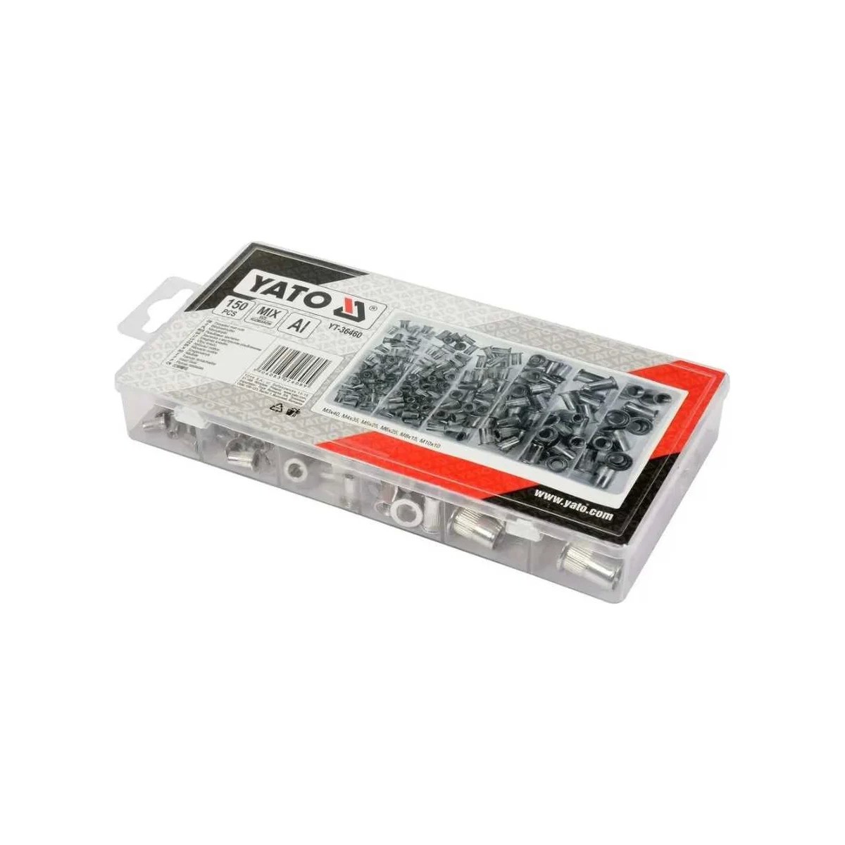Комплект алюминиевых заклепочных гаек размеров М3 - М10 фирмы YATO. Глухие заклепочные гайки позволяют вкручивать винт или болт с метрической резьбой в листовой металл или другие материалы, где нет возможности сделать резьбу.