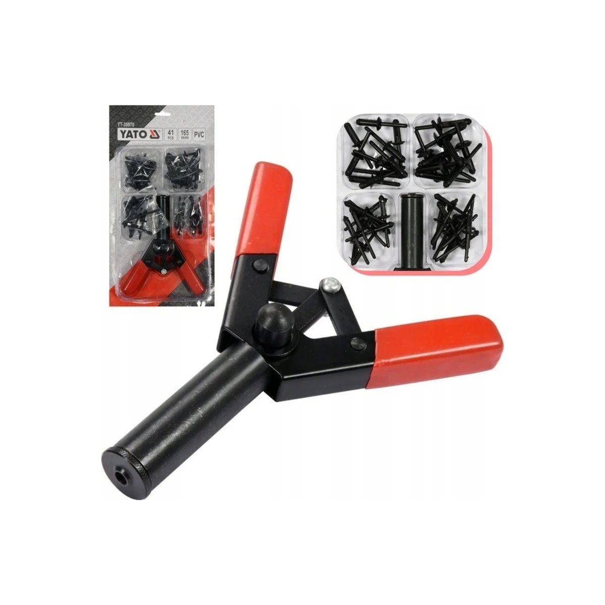 Заклепочник для пластиковых заклепок YATO набор 41 предмет YT-35970 предназначен для работы с пластиковыми заклепками. Подходит для обивки автомобиля, крышки двигателя, колесных арок.